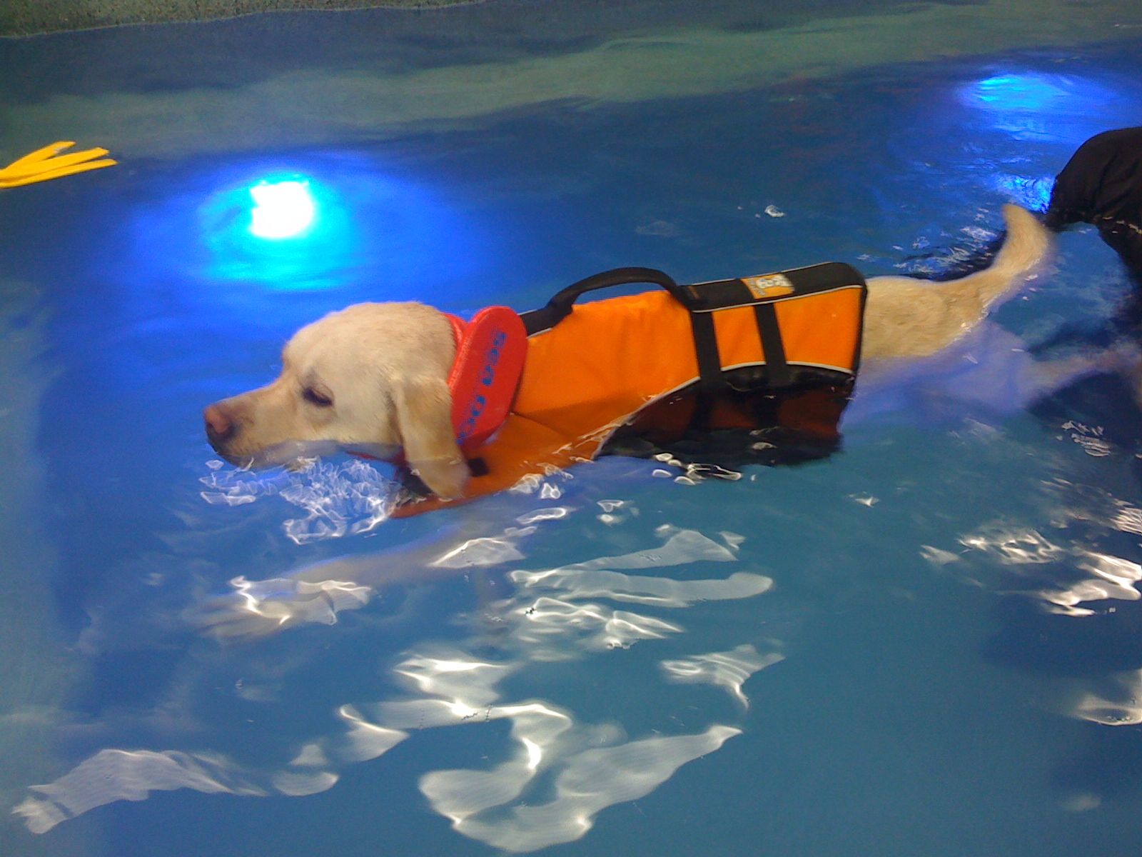 We take her swimming every Saturday morning to help her elbow, which she had a problem with when she was a puppy. Since she’s not the best swimmer, we find it helps for her to wear a life vest and a neck float. So embarrassing! (It kills me, so hilarious - We love her :) .)